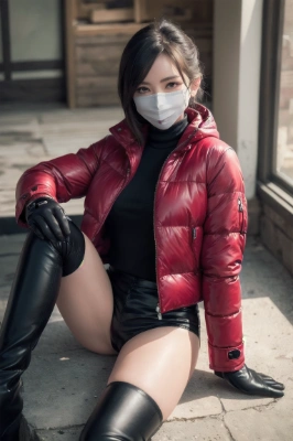 (photorealistic:1.4), (RAW photo), masterpiece, best quality, extremely detailed, lady, (red short puffer jacket:1.1), leather short pants, (knee high boots:1.2), (mask:1.2), sexual arousal, feel horny, seduced, cute, almond shaped eyes, cold gaze, staring, fearless smile, tongue licking,
