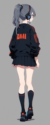 Age: 16 years old, female, dark gray hair, ponytail, navy blue eyes, black jacket with orange pattern, exposed belly button, black T-shirt, black skirt, black socks, thigh belt accessories, black headphones, absolute area, flat Chest, standing figure, full body illustration, one hand peace sign,(background black).,
