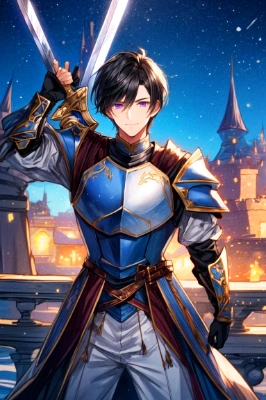 MASTERPIECE, best quality, high quality, extremely detailed, very delicate and beautiful, (female 18 years old alone solo: 1.2), (long black hair, two-side up to waist: 1.4), fringes to eyebrows, eyes glazed. Sharp, strong glossy twinkle eyes, glossy eyebrows, (eye colour magenta: 1.2), 6.5 head tall, (knight in armour fashion: 1.3), knee socks, lace, frills, (holding up sword: 1.3), (smiling), (dynamic pose), (background castle: 1.3), blue sky.
