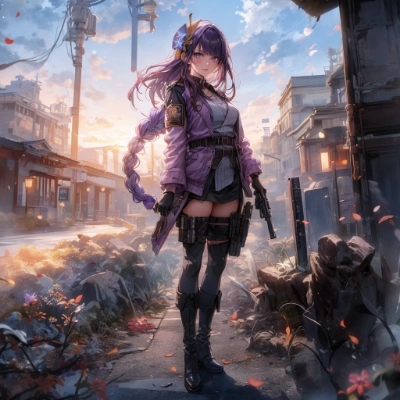 hires, cinematic angle,beautiful face,finely detail, masterpiece, best quality, ultra-detailed,Photorealistic,8k,lens flare,intense shadows,Studio,dreamy washes,bokeh photography,dreamy ambiance,beautiful detailed glow,colorful refraction,golden hour lighting,backlighting,colorful lighting,1girl, solo,(full body:1.2),(watercolor \(medium\):0.25),<lora:watercolor:0.25>,<lora:midjourney_20230624181825:0.35>,(xuer swing:0.25),<lora:xuer swing_20240215221119:0.25>,<lora:flat2:-0.5>,<lora:raidenshogun1-000009:0.8>,(raidenshogundef:0.5),(raiden shogun:1.0),(cool woman,mature female,mature,30 years old:1.1),(purple eyes,braid,purple hair,long hair,blunt bangs,:1.2),flower hair ornament,medium breasts,seductive smile,looking at viewer,(holding gun,:1.4),standing,smile,(military jacket,black shors,black gloves,leather boots,black clothe,gun holster,:1.4),(ruins,night,darkness,:1.2),ruined cityscape,fancy,fantasy,fancy,cute,cute,