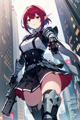 masterpiece, best quality, extremely detailed, anime, girl, skirt, knight, a pretty woman, <lora:gunAimingAtYouV1:1>, gunatyou, gunatyou, twintail, green hair, red eyes, female knight, elf, colorful, cyberpunk, mecha, motorcycle, gun, science fiction(I am an elf knight from the future. Therefore, my weapon is not a sword but a gun. I am also equipped with a protector-like armor.),