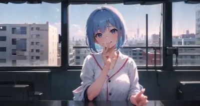 absurdres, highres, reflection, refraction:1.4, BREAK, 1girl, face up, close up, eyes closed, incoming kiss, wearing white coat, V-necked sweater, short pleated skirt, short blue bob hair, medium breasts, shy, red face, soft and wet lips, tongue out, face up, looking at viewer, highly detailed background, laboratory, curtain, window, cityscape, blue sky, cinematic lighting, horizon,
