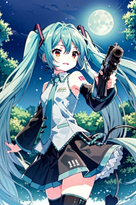 1girl, hatsune miku, vocaloid, masterpiece, best quality, rating: general, newest,tail,longhair,zettai ryouiki,mini skirt,blue hair,green hair,red eyes,small devil,demon,succubus,fantasy,<lora:gunAimingAtYouV1:1>, gunatyou,night,full moon,forest