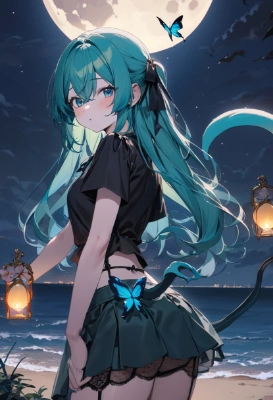 1girl, hatsune miku, vocaloid, masterpiece, best quality, rating: general, newest,tail,longhair,blue hair,green hair,demon,succubus, atyou,night, ,tail,small devil,tail,blue eyes,tail,tail <lora:AimingAtYouV1:1>,flower,fantasy, at night,tail,mini skirt,short sleeve,tail,wink,bedroom,tail