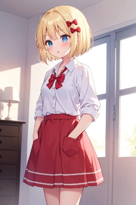 1girl, blonde hair, blue eyes, red bow, short hair,(hair bow:1.3),red bow, walking on abandoned railroad tracks, mountains in distance, casual clothes, (girl:1.1), (blonde hair:1.1),(blue eyes:1.1), (red bow:1.1), (short hair:1.1), (walking on abandoned railroad tracks:1.2), (mountains in distance:1.2), (casual clothes:1.2),detailed oil painting