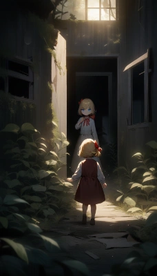 1girl, blonde hair, short hair, (hair bow,red bow:1.2), blue eyes, wearing, white shirt, red skirt, looking for, lost item, searching, inside, bag, pockets, desperately, indoor, bedroom, earnestly, rays of light, sparkles, masterpiece, best quality, very aesthetic