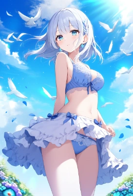 masterpiece, best quality, an elf holding a black rose , lying on a canopy bed. Her short silver braid hair and purple eyes. She wears a camisole outfit with frilly trim and ruffled sleeves, revealing her dainty shoulders, many black petals floating in the air, and her red eyes lending an air of mystery. increase. , official art, {{ultra-detailed}}, {{high resolution}}, dynamic fuzziness, intricate light, colorful, hdr, insanely detailed and intricate, hypermaximalist, elegant, ornate, super detailed, with blush cheeks, cowboy shot, underwear, girl ,solo, 20 years old, bra,