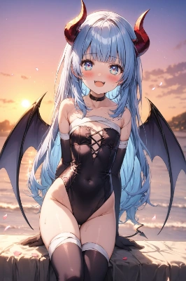 Masterpiece, best quality, extremely detailed, (illustration, official art: 1.1), (((((1 girl))))), ((light blue long hair))), light blue hair, 10 years old, ((blush)), cute face, big eyes, tareme, masterpiece, best quality, ((a very delicate and beautiful girl)))), , loli girl,amazing, beautiful detailed eyes, blunt bangs (((little delicate girl)))), tareme (true beautiful: 1.2),, small girl,,thighs 、 Longhaire、,blush,Happy smile, ,sweat:1.2、black choker, silver earrings, evil smile, smug, demon girl, black thighhighs, (black leotard:0.8), strapless leotard, elbow gloves, black gloves, collarbone, bare shoulders, horns, demon wings, demon tail, open mouth, fangs <lora:deluster1:1> <lora:sensualface_type2:1> ,