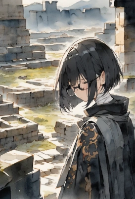 ((roughly drawn watercolor)), masterpiece, best quality, extremely detailed, anime, ((decadent style)), (a girl with bandages), solo, (blood smeared), ((wearing cracked glasses)), ((wearing tattered clothes)), face down, both eyes closed, ((standing in a ruined city)), smoke smoldering here and there, sadness, loneliness, worrying, bobcut, black hair, wide view, landscape, dutch angle, <lora:flat1:-0.5> <lora:saturation:-0.5>,