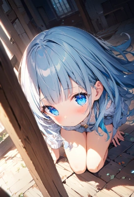 Masterpiece, best quality, extremely detailed, (illustration, official art: 1.1), (((((1 girl))))), ((light blue long hair))), light blue hair, 10 years old, ((blush)), cute face, big eyes, tareme, masterpiece, best quality, ((a very delicate and beautiful girl)))), , loli girl,amazing, beautiful detailed eyes, blunt bangs (((little delicate girl)))), tareme (true beautiful: 1.2),, small girl, petite and sweet,(Composition looking up from a low position)、,1girl,,,dystopia,post-apocalypse,retrospective,nostalgia,sense of depth,from behind,dynamic angle,in a group of ruined buildings,ruins deep in the forest,science fiction-style ruins with vines and ivy,sunset,cyberpunk,Water Reflection,small flower garden,flower petal, full-body <lora:deluster1:1> <lora:sanDka2:1> ,,