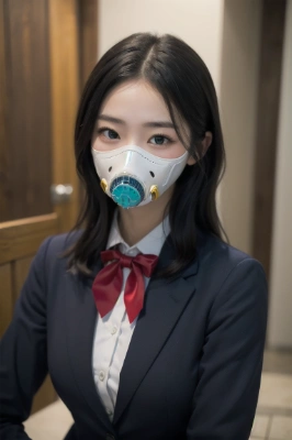 (photorealistic:1.4), (RAW photo), masterpiece, best quality, extremely detailed, lady, neat and clean, elegant, shiny white tight satin shirt, rubber gas mask, black leather skirt, long rubber boots, almond shaped eyes, cold gaze, staring, fearless smile, standing, dilapidated building in the background,