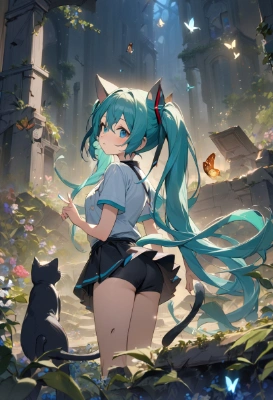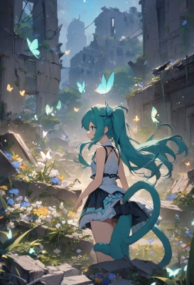 1girl, hatsune miku, vocaloid, masterpiece, best quality, rating: general, newest,tail,longhair,blue hair,green hair,blue eyes,ruins,t,night,flower,tail,tail, atyou, ,tail,mini skirt ,tail <lora:brighter-eye2:1> <lora:gloweyes_v100:1>,tail,butterfly,tail,fantasy,twintail,cat,forest