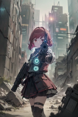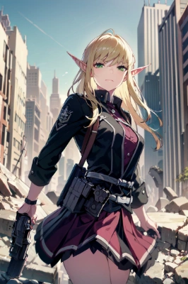 masterpiece, best quality, extremely detailed, anime, girl, skirt, ruins, a pretty woman, <lora:gunAimingAtYouV1:1>, gunatyou, gunatyou, longhair, wet hair, silver hair, yellow eyes, elf, female knight, colorful, cyberpunk, science fiction, gun, machine(The beastman adventurer's sister stands in the ruins, holding a gun and looking around the area.),