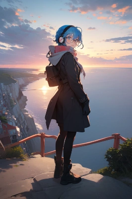 The sunrise sky, the roof of a skyscraper, a girl standing with her back to the sun, 1girl, glasses, solo, Strong winds, blowing clouds,