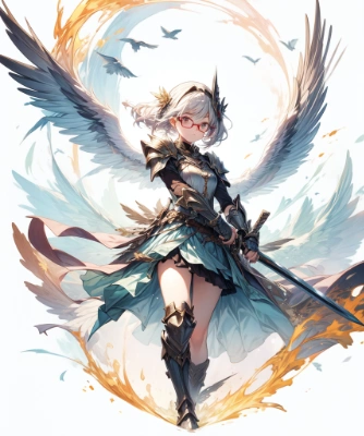 A night sky with seven moons shining, a winged cat soaring with the moon on its back, and falling petals,
