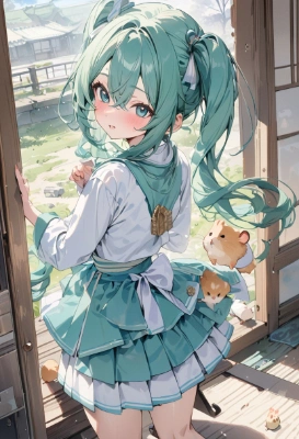 masterpiece, best quality, extremely detailed, anime, girl, 1girl, hatsune miku, vocaloid, masterpiece, best quality, rating: general, newest,hamster,blue hair,green hair,clear ,clear ,clear sky,school,mini skirt,short sleeve
