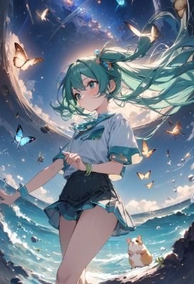 masterpiece, best quality, extremely detailed, anime, girl, 1girl, hatsune miku, vocaloid, masterpiece, best quality, rating: general, newest,hamster,blue hair,green hair,clear ,clear ,mini skirt,short sleeve,sea,fantasy,space,ry ,star,butterfly,fairy,night,flower,dolphin