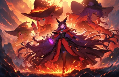many girls,full body,cute face,sexy witch,(Different ages girls), (Different hair colours),(Different eye colours),side braid,thighs,(absurdly long hair),beautiful eyes,(glowing skin),witch hat,dynamic pose,holding a grimoire,small breasts,Lava,eruptions,volcanoes,backlighting,