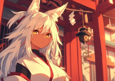 anime cel, japanese veranda, wabisabi guarden, killer queen, beautiful cute dark-skinned girl, japanese miko clothes, silk texture, black undershirt, white hair, fox ears, thick eyebrows, imaginary lighting, strong blur, --ar 24:17 --niji 6