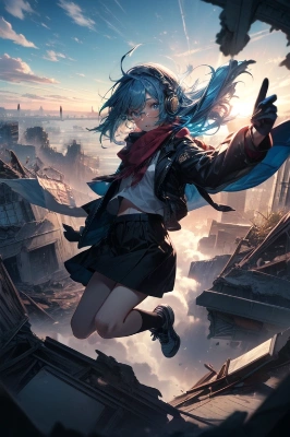 A toy figure wearing a headset, 1girl, solo, blue hair, gloves, glasses, A canvas-colored scarf that covers the lower half of the face, Eyes that shine like jewels, (on a clouds overlooking the ((city of ((ruins))))), A clear sky, above the clouds, a girl flying looking down at the sea, 1girl, glasses, solo, Strong winds, blowing clouds, A girl jumping out of an explosion, huge explosion, A huge exploding ruin, A girl jumping backed by the blast, A girl jumping with her arms raised, A girl jumping horizontally across the screen, on a volcano in front of fire, more_details:-1, more_details:0, more_details:0.5, more_details:1, more_details:1.5
