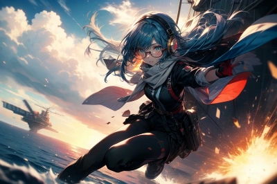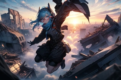A toy figure wearing a headset, 1girl, solo, blue hair, gloves, glasses, A canvas-colored scarf that covers the lower half of the face, Eyes that shine like jewels, (on a clouds overlooking the ((city of ((ruins))))), A clear sky, above the clouds, a girl flying looking down at the sea, 1girl, glasses, solo, Strong winds, blowing clouds, A girl jumping out of an explosion, huge explosion, A huge exploding battle ship, A girl jumping backed by the blast, A girl jumping with her arms raised, A girl jumping horizontally across the screen, on a volcano in front of fire, more_details:-1, more_details:0, more_details:0.5, more_details:1, more_details:1.5