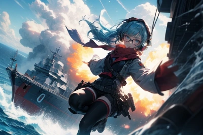 A toy figure wearing a headset, 1girl, solo, blue hair, gloves, glasses, A canvas-colored scarf that covers the lower half of the face, Eyes that shine like jewels, (on a clouds overlooking the ((battle ship))), A clear sky, above the clouds, a girl flying looking down at the sea, 1girl, glasses, solo, Strong winds, blowing clouds, A girl jumping out of an explosion, huge explosion, A huge exploding battle ship, A girl jumping backed by the blast, A girl jumping with her arms raised, A girl jumping horizontally across the screen, on a volcano in front of fire, more_details:-1, more_details:0, more_details:0.5, more_details:1, more_details:1.5