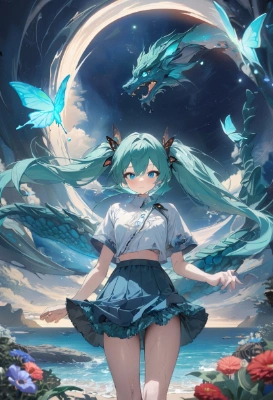 masterpiece, best quality, extremely detailed, anime, girl, skirtmasterpiece, best quality, extremely detailed, anime, girl, skirt1girl, hatsune miku, vocaloid, masterpiece, best quality, rating: general, newest,mini skirt,blue hair,green hair,blue eyes,different world,fantasy,flower,space,butterfly,sky,starry sky,night,sea,beach at night,cat