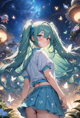 masterpiece, best quality, extremely detailed, anime, girl, skirtmasterpiece, best quality, extremely detailed, anime, girl, skirt1girl, hatsune miku, vocaloid, masterpiece, best quality, rating: general, newest,mini skirt,blue hair,green hair,blue eyes,different world,fantasy,flower,space,butterfly,sky,starry sky,night, at night,tail,longhair,fairy,wet hair