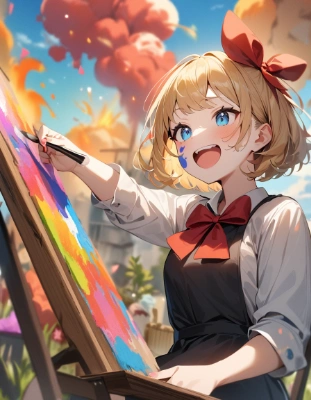 1girl, blonde hair, blue eyes, short hair, (hair bow,red bow:1.2), young, sitting, drawing on canvas, saying "art is an explosion!", passionate facial expression, colorful palette, brushes, focused on artwork, outdoor scenery, masterpiece