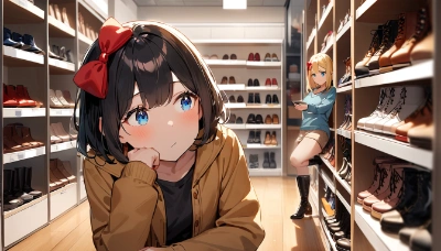 2girls,blonde hair, short hair, (hair bow,red bow:1.2), blue eyes, in a shoe store, browsing, (various women's boots:1.2), carefully comparing, thinking hard, can't decide which to buy, next to her, black hair, girl friend, giving suggestions, discussing pros and cons, surrounded by shelves full of shoes, focused only on boots selection, indoor, warm lighting, detailed scene