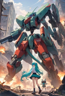 masterpiece, best quality, extremely detailed, anime, girl, skirtmasterpiece, best quality, extremely detailed, anime, girl, skirt1girl, hatsune miku, vocaloid, masterpiece, best quality, rating: general, newest,mini skirt,blue hair,green hair,ry , at ,tail,blue eyes,longhair,ry ,ruins,explosion, atyou,city <lora:AimingAtYouV1:1>,<lora:AimingAtYouV1:1>, atyou,gun,robot,mecha,machine,motorcycle,<lora:gunAimingAtYouV1:1>, gunatyou,steampunk,science fiction,monster