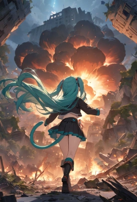 masterpiece, best quality, extremely detailed, anime, girl, skirt1girl, hatsune miku, vocaloid, masterpiece, best quality, rating: general, newest,mini skirt,longhair,tail,blue hair,green hair,red eyes ,explosion, gunatyou,ruins,night,boots <lora:brighter-eye2:1> <lora:gunAimingAtYouV1:1>