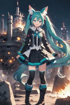 masterpiece, best quality, extremely detailed, anime, girl, skirtmasterpiece, best quality, extremely detailed, anime, girl, skirt1girl, hatsune miku, vocaloid, masterpiece, best quality, rating: general, newest,mini skirt,longhair,tail,blue hair,green hair, ,explosion, atyou,ruins,night, ,magic,magical girl, ,tail,fantasy ,red eyes,robot,mecha,steampunk,boots <lora:AimingAtYouV1:1> <lora:gloweyes_v100:1>,city