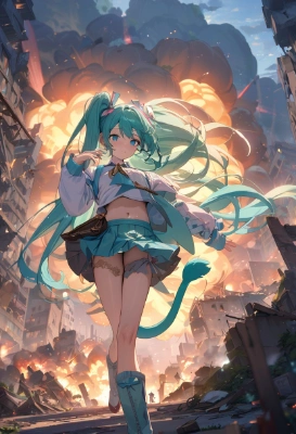 1girl, hatsune miku, vocaloid, masterpiece, best quality, rating: general, newest <lora:brighter-eye2:1> <lora:gloweyes_v100:1> masterpiece, best quality, extremely detailed, anime, girl, skirtmasterpiece, best quality, extremely detailed, anime, girl, skirt1girl, hatsune miku, vocaloid, masterpiece, best quality, rating: general, newest,mini skirt,longhair,tail,blue hair,green hair, ,explosion, atyou,ruins,night, ,al girl, ,tail,fantasy ,robot,steampunk,boots ,city, ,blue eyes <lora:AimingAtYouV1:1>,science fiction, explosion, boots, girl, twintail, longhair, blue hair, green hair, blue eyes,