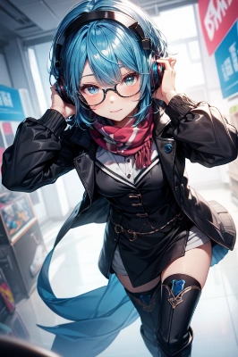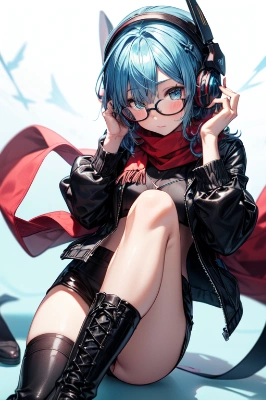 A toy figure wearing a headset, 1girl, solo, blue hair, short hair, glasses, A canvas-colored scarf that covers the lower half of the face, Eyes that shine like jewels, beautiful eyes, 1girl, solo, blush, heart-shaped pupil, knee boots,