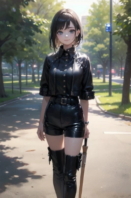 (photorealistic:1.4), (RAW photo), masterpiece, best quality, extremely detailed, girl, leather short pants, (knee high boots:1.2), neat and clean, active, almond shaped eyes, smile, staring, standing, waiting for someone, in the park,