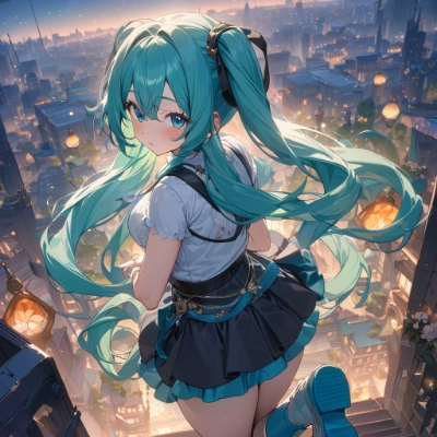 1girl, hatsune miku, vocaloid, masterpiece, best quality, rating: general, newestmasterpiece, best quality, extremely detailed, anime, girl, skirt1girl, hatsune miku, vocaloid, masterpiece, best quality, rating: general, newest,mini skirt,blue eyes,blue hair,green hair,boots,fantasy,clear ,flower,longhair,city,summer,ry sky,starry sky,night ,