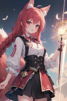 masterpiece, best quality, extremely detailed, anime, girl, skirt, Braids, girl, braids, purple hair, red eyes, magical girl, fox girl, colorful, steampunk, magic(The braided beast girl is waving a magic wand and is really beautiful and cute.),