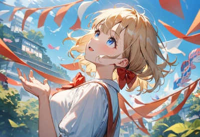 1 girl,loli,blond hair,short hair,(hair bow:1.2),red bow,blue eyes,blue eyes,(magical girl:1.2),(witch hat:1.3), magical musket, ,smile, standing,outdoor