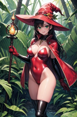 (photorealistic:1.4), (RAW photo), masterpiece, best quality, extremely detailed, lady, witch, black long curly hair, red eyes, cold gaze, fearless smile, cute, seduced, violet leotard, violet puffer jacket, knee high boots, (leather gloves:1.2), witch hat, rubber cape, has a magic staff, staring, standing, in the coniferous forest,,,