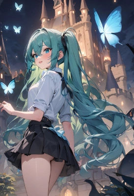 masterpiece, best quality, extremely detailed, anime, girl, skirt1girl, hatsune miku, vocaloid, masterpiece, best quality, rating: general, newest,mini skirt,blue hair,green hair,blue eyes,Garbage Day,ruins,night,full ,rain