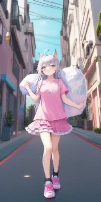 1girl, solo, breasts, looking at viewer, blush, short hair, bangs, shirt, animal ears, green eyes, standing, full body, white shirt, pink hair, ahoge, short sleeves, outdoors, frills, shoes, shorts, day, cat ears, medium hair, bag, animal ear fluff, short shorts, denim, building, sneakers, blue shorts, denim shorts, road, street
