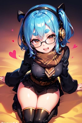 (black and gold headphones, 1girl, solo, reddish brown eyes, blue hair, blue eyebrows, short hair, bangs, fluffy hair, (glasses, thick eyebrows, short eyebrows, droopy eyes):1.8, thick and short eyebrows, brown scarf that covers the lower half of the face, dark brown scarf, Railway employee black uniform, long sleeves, belt, skirt, boots, Eyes that shine like jewels, beautiful eyes, eyes full of hope, Lustrous skin, shiny skin, big eyes, large eyes, ultra detailed eyes, beautiful detailed eyes, (Jig eyes), delicate colors, illustration, bright colors, beautiful hair, (slender, skinny):1.4):1.4, ((side ponytail):2.0) close-up face, full face blush, hair over eyes, (Throwing hearts):2.0, one eye opened and one eye closed, majestic, , ribbon braided in hair, naughty face, (doyagao),smug,:3,open mouth,:d,smile,half_closed eyes,grin,jitome , more_details:1.5,full-face blush,(heart-shaped pupils):1,6,more_details:-1, more_details:0, more_details:0.5, more_details:1, more_details:1.5,full-face blush,heart-shaped pupils,action pose