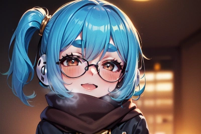(black and gold futuristic headphones, 1girl, solo, reddish brown eyes, blue hair, blue eyebrows, short hair, bangs, fluffy hair, (glasses, thick eyebrows, short eyebrows, droopy eyes):1.8, thick and short eyebrows, dark brown scarf that covers the lower half of the face, dark brown scarf, Railway employee black uniform, long sleeves, belt, skirt, black stockings, garter belt, boots, Eyes that shine like jewels, beautiful eyes, eyes full of hope, Lustrous skin, shiny skin, big eyes, large eyes, ultra detailed eyes, beautiful detailed eyes, (Jig eyes), delicate colors, illustration, bright colors, beautiful hair, (slender, skinny):1.4):1.4, ((side ponytail):2.0) close-up face, full face blush, hair over eyes, (Throwing hearts):2.0, one eye opened and one eye closed, majestic, , ribbon braided in hair, naughty face, (doyagao),smug,:3,closed mouth,:d,smile,half_closed eyes,grin,jitome , more_details:1.5,full-face blush,(heart-shaped pupils):1,6,more_details:-1, more_details:0, more_details:0.5, more_details:1, more_details:1.5,full-face blush,heart-shaped pupils,action pose