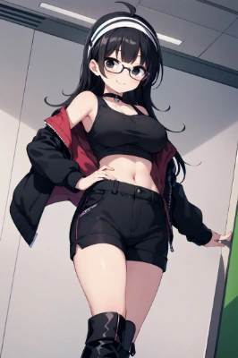 Wearing glasses, elementary school student, black hair, black eyes, round face, tall, in the city, kind smile, very large breasts, long hair reaching down to her waist, black hair with a slight brown tint, wearing a headband, wearing black hot pants, white tank top, black boots, black jacket, troublesome...,