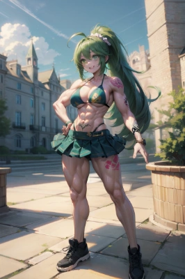 masterpiece, best quality, extremely detailed, anime, girl, skirt <lora:flat2:0> <lora:hairdetailer:1> , standing, smile, castle, colorful, foreshortening, big sister, green eyes, green hair, twintail, braids, a pretty woman, Twintails,swimsuit,bodybuildng,,