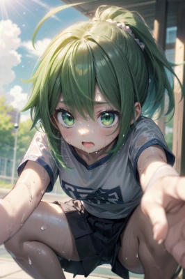 masterpiece, best quality, extremely detailed, anime, girl, skirt <lora:flat2:0> <lora:hairdetailer:1> , standing, smile, happy, castle, colorful, foreshortening, big sister, green eyes, green hair, ponytail, longhair, ahoge, a pretty woman,big muscies,bodybuildng,bikini swimwear,whole body tattoo,,