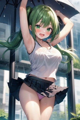 masterpiece, best quality, extremely detailed, anime, girl, skirt, crouching, laughing, blushing, panty shot, rainy day, church, foreshortening, colorful, fantasy, student, younger sister, green eyes, green hair, T shirt, ponytail, wet hair, girl,big breasts,,,