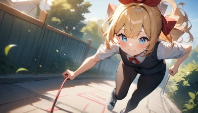 1girl, short blonde hair, blue eyes, red hair bow, (hair bow:1.3),red bow,(bundling paper with rubber band:1.3), ( rubber band:1.4),sitting at desk, stationary supplies, afternoon sun from window, (masterpiece:1.2), (best quality:1.3), (very aesthetic:1.2)