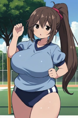 masterpiece, best quality, extremely detailed, anime, teenage girl, big breasts, fair skin, dark brown hair, ponytail, blue eyes, (((blue buruma))), gym uniform, red leather backpack, smile, flower garden, <lora:agomaru:1> <lora:eyecolle_rose_v100:1> ,